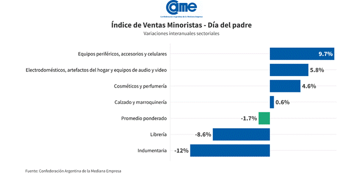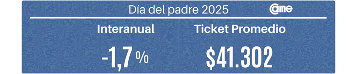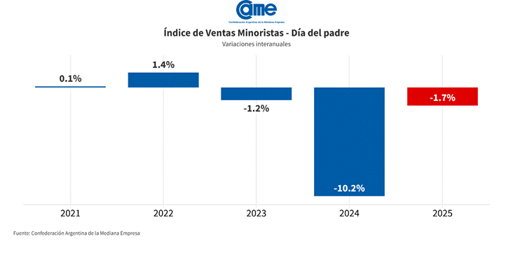 El Índice de Ventas Minoristas para el Día del Padre elaborado por la Confederación Argentina de la Mediana Empresa (CAME) registró por tercer año consecutivo una variación interanual negativa, reflejando una tendencia sostenida de debilidad en el consumo vinculado a esta celebración.