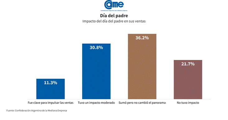 En cuanto a la percepción de los comerciantes, el 58% de los encuestados señaló que el Día del Padre no tuvo impacto o, si bien sumó algo de movimiento, no modificó la realidad comercial del mes. Sólo un 11,3% afirmó que la fecha fue clave para impulsar las ventas, como se detalla en el gráfico “Impacto del Día del Padre en sus ventas”.