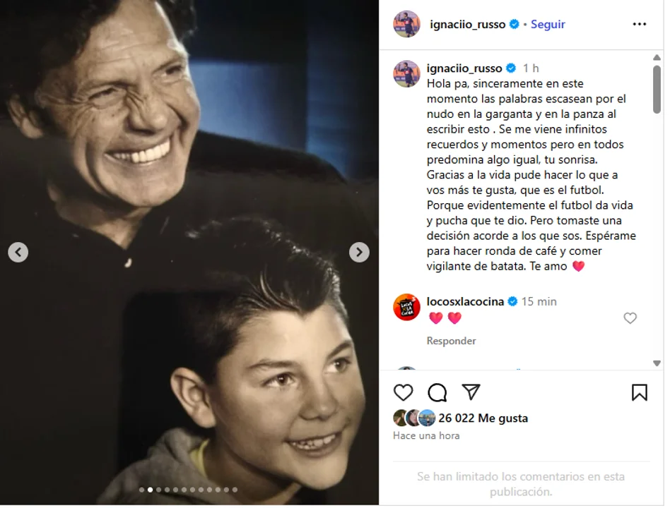 Con un carrusel de varias imágenes de ambos a lo largo de los años, Nacho escribió a corazón abierto en la descripción de posteo para enviarle un sentido mensaje a “Miguelo”. “Hola pa, sinceramente en este momento las palabras escasean por el nudo en la garganta y en la panza al escribir esto”, comenzó el texto como si estuviera hablando directamente con el ex mediocampista.
