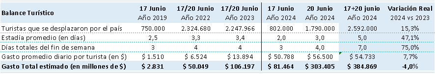 lPero en el balance final, festejar los feriados en fines de semana separados, como sucedió este año, terminó siendo mejor para la actividad: si se agregan los resultados de este fin de semana con los del feriado del pasado 17 de junio, al sumar siete días, casi 2,6 millones de personas salieron de paseo, es 15,3% más que en los cuatro días que duró el fin de semana combinado de 2023.