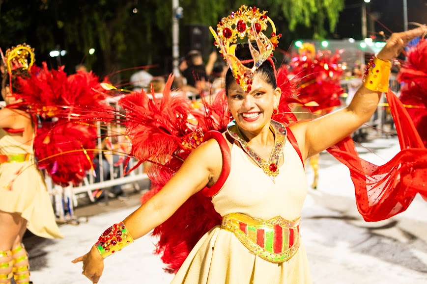 La representante departamental vigente, Melanie Hereñú, acompañó a las candidatas al título 2026: Nicole Deusich, Melanie Gerdau y Luján Juárez. A lo largo del desfile, Obrigado Batería, Los Reyes del Samba, Noche de Reinas, Jarana, La Fábrica de Pasistas y El Batuque desplegaron ritmo, color y alegría ante el público presente.