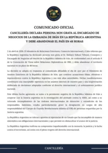 Según indicaron desde el Ministerio de Relaciones Exteriores y Culto, la decisión fue tomada en respuesta al texto oficial difundido, durante el día de ayer, por el Ministerio de Asuntos Exteriores de la República islámica de Irán que, según el Gobierno, «contiene acusaciones falsas ofensivas e improcedentes contra la República Argentina”.