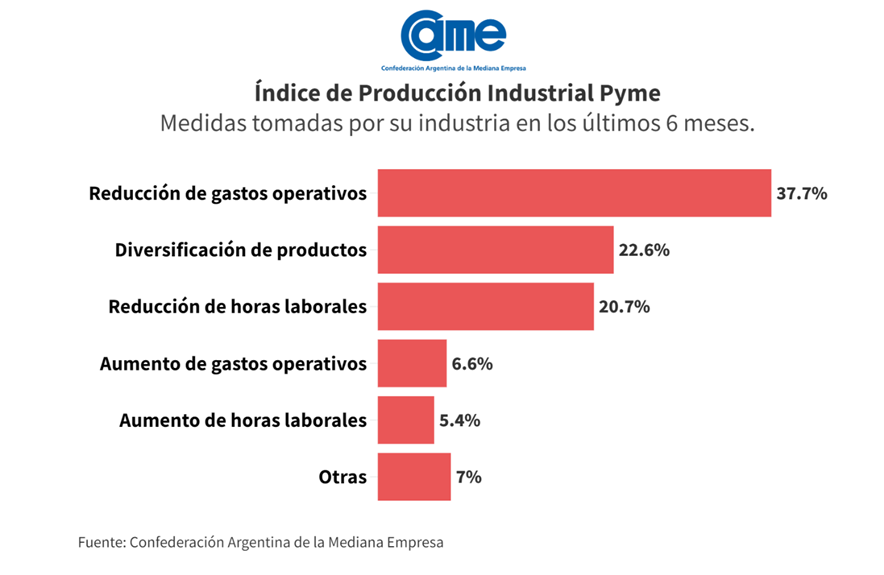 Por otro lado, las industrias fueron consultadas respecto a las medidas tomadas en los últimos 6 meses para adaptarse al contexto. El 37,7% de las empresas afirmó haber reducido gastos operativos, el 22,6% dijo haber diversificado los productos y otro 20,7% redujo las horas laborales.