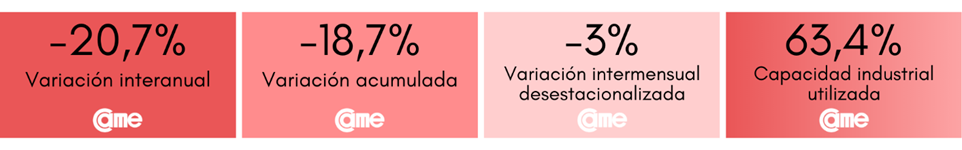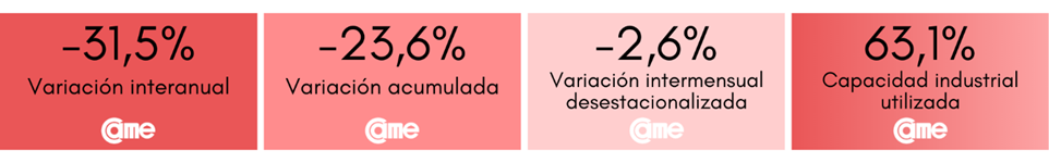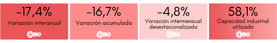 El sector registró una caída de 17,4% anual a precios constantes en junio y de -4,8% en la comparación mensual. Para el primer semestre del año acumula una baja de 16,7% anual. Las industrias operaron con apenas 58,1% de su capacidad instalada en el sexto mes del año (72,4% en mayo), niveles muy bajos para lo habitual del sector.