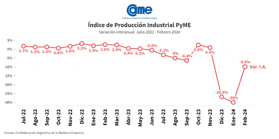 La industria manufacturera pyme se retrajo 9,9% en febrero frente al mismo mes del año pasado, a precios constantes. Es el tercer mes consecutivo en que la actividad fabril cae, aunque aminoró la tasa luego de haberse retraído entre 27% y 30% en diciembre y enero, respectivamente. En la comparación mensual, desestacionalizada, también se registró un descenso de 7,7% y en el acumulado del año la actividad cae 21,7%.