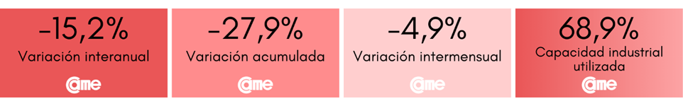 El sector experimentó una marcada caída de 24,6% anual a precios constantes en febrero y acumula un descenso de 26% en el primer bimestre del año. En términos mensuales también se registró una retracción de 4,8%. Las empresas operaron con 76,3% de su capacidad instalada, 1,8 puntos más que en enero. Hubo un deterioro significativo en la cadena de pagos y más problemas para cobrarle al cliente. Eso, sumado a los incrementos en los costos operativos, deterioraron la rentabilidad de la actividad. Frente a la falta de demanda, las industrias tuvieron dificultades para trasladar los mayores costos a precios, en un mercado de consumo que crece lento.