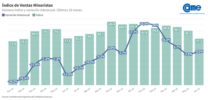 Las ventas minoristas pyme bajaron 0,5% interanual en junio