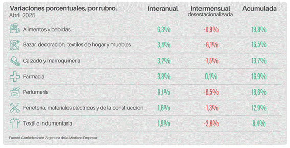Todos los rubros relevados registraron subas interanuales en sus ventas. El crecimiento más fuerte se dio nuevamente en Perfumería, con un 9,1%, seguido por Alimentos y bebidas, con un 6,3%. Si analizamos el acumulado de los primeros cuatro meses, Alimentos y bebidas mantiene el mayor crecimiento con un 19,8%.