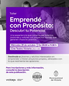 El próximo miércoles 29 de octubre se desarrollará en el Cine Teatro Victoria el taller “Emprendé con propósito: descubrí tu potencial”, una actividad destinada a jóvenes y adultos interesados en iniciar proyectos propios alineados con sus valores y pasiones. La jornada se extenderá de 9:30 a 11:30 y tendrá una duración total de dos horas.