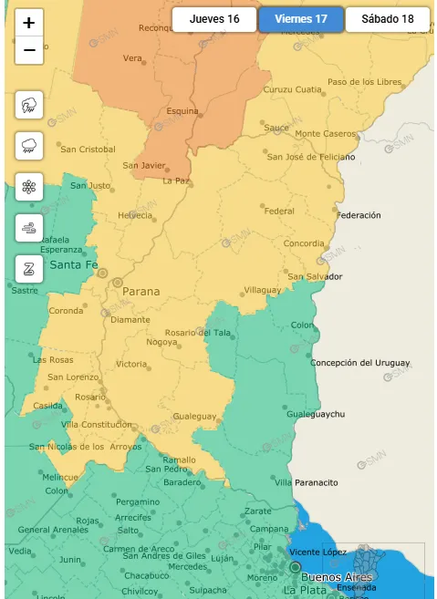 El Servicio Meteorológico Nacional -SMN- informa que rige un alerta amarillo por tormentas para este viernes. Son 12 los departamentos en los que se esperan tormentas de variada intensidad durante toda la jornada: Federación, Feliciano, Federal, Concordia, La Paz, Paraná, Diamante, Victoria, Gualeguay, Nogoyá, Villaguay y San Salvador.
