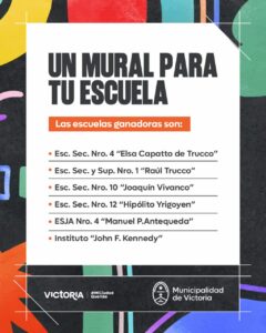 Concluyó la convocatoria del programa “Un mural para tu escuela”, una propuesta impulsada por la Dirección de Cultura de la Municipalidad de Victoria que buscó fomentar la participación activa de adolescentes y jóvenes, promoviendo valores como la inclusión, el respeto, la creatividad y el sentido de pertenencia a la comunidad educativa.