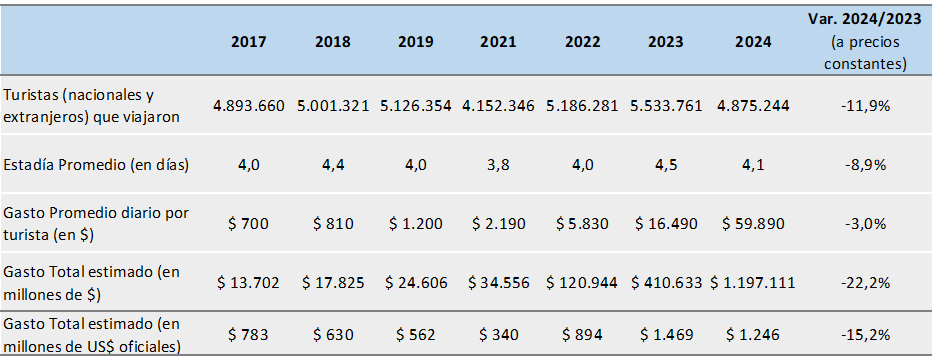 lLa estadía media bajó de 4,5 días en 2023 a 4,1 este año y el gasto diario en promedio fue de $59.890, que a precios reales (es decir, descontando la inflación) resultó 3% inferior a la temporada pasada.